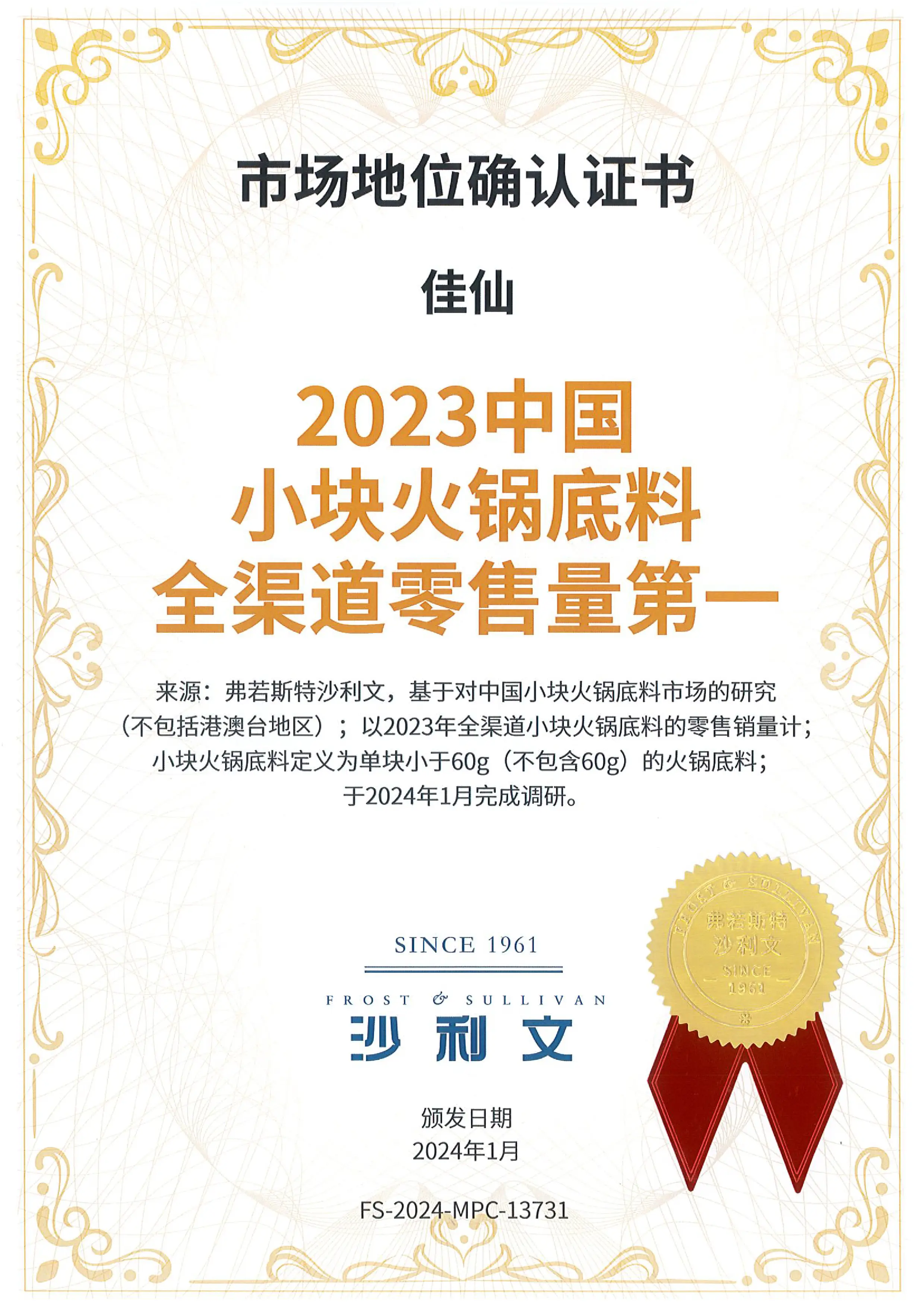 近日,重庆佳仙食品获国际权威调研机构弗若斯特沙利文(简称“沙利文”)授予的“2023中国小块火锅底料全渠道零售量第一”市场地位确认证书。