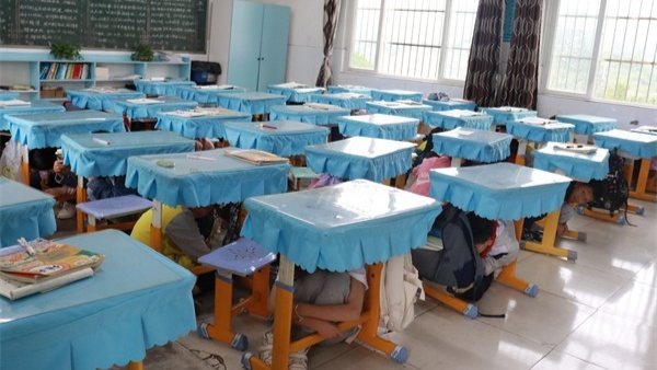 随着警报拉响,防震减灾疏散演练拉开序幕。老师们听到“地震警报”信号后立即停止授课,指挥学生迅速蜷曲身体,躲在各自的课桌下,并尽可能用书包、课本或双手护住头部。听到逃生疏散口令时,老师带领学生们迅速撤离教室,以最快速度到达安全指定位置。