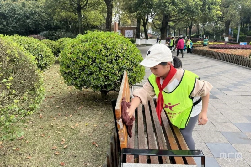 学生正在擦拭公园长椅(渝北区回兴小学校供图)
