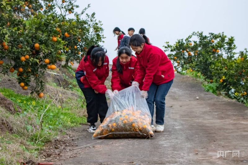 学生们将烂果装袋运出果园(忠县中学校供图)
