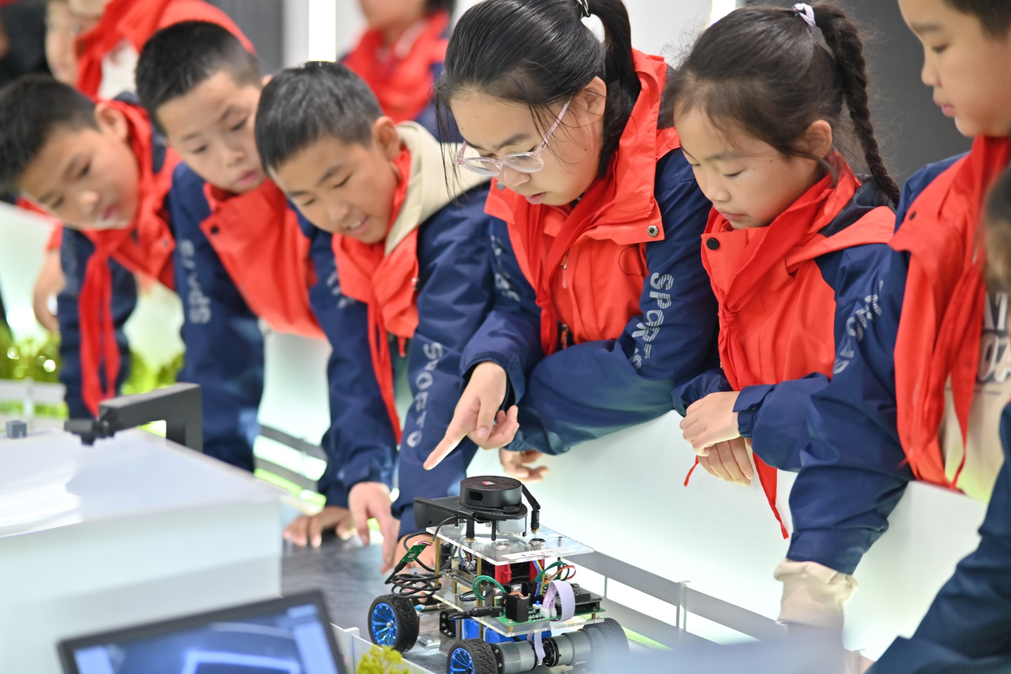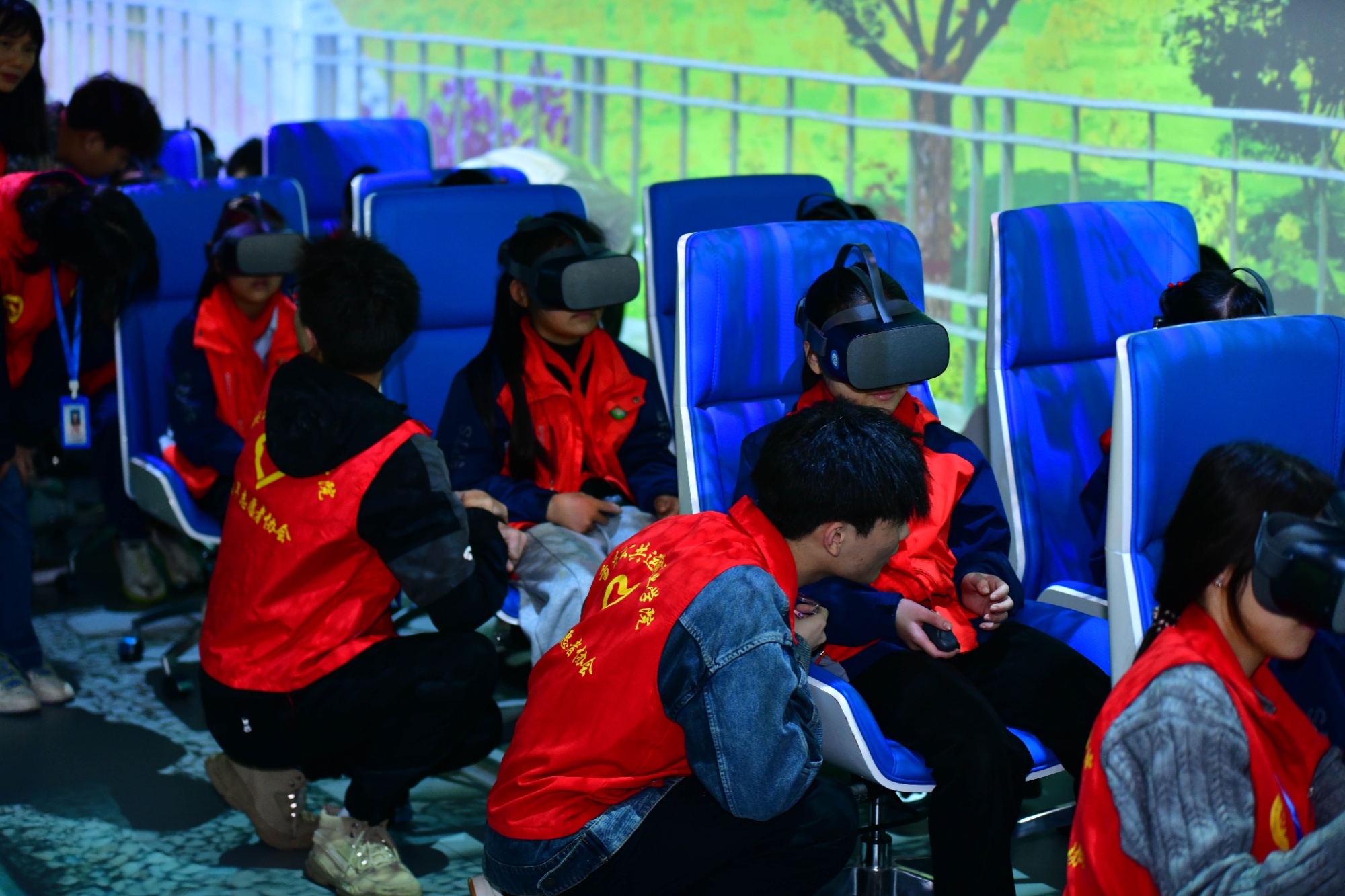 在虚拟仿真实训基地,小学生们戴上VR头盔,切身感受成渝铁路修筑过程中的不易和艰辛;在全国城轨与高铁技术共享实训基地,他们“开”上了火车,通过铁路机车模拟驾驶体验,过了一把“司机”瘾;在智慧交通实训室,他们观摩了人工智能智慧社区模拟动态场景展示……真实触碰、多种体验、交流学习,活动中,小学生们知道了更多有关交通的知识,参加志愿服务的大学生也在其中得到了锻炼。