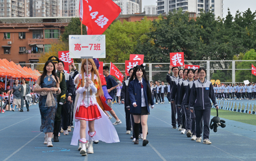 开幕式高潮迭起,76支参赛队伍创意频出,将校庆元素与体育精神深度融合:有的班级高举学校发展历程照片展板,致敬校史荣光;有的班级制作插着7根蜡烛的巨型生日蛋糕模型,寓意70年风雨兼程;更有班级将轮滑、自行车、拉丁舞等体艺特色秀搬上舞台,彰显学校五育并举办学成果。
