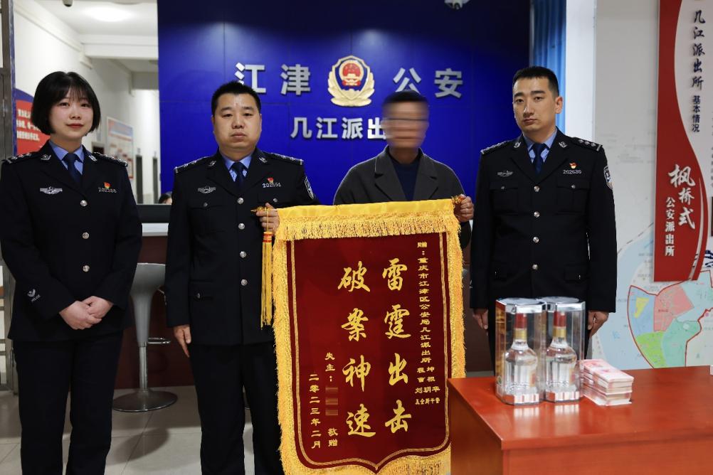 返还仪式上,何某领回被盗资金和物品,并向公安机关送上写有“雷霆出击,破案神速”八个大字的锦旗,感谢民警全力破案,为他追回受损钱财。