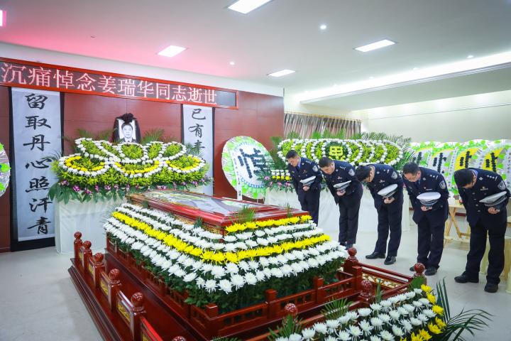 在渝北区殡仪馆,姜瑞华身穿藏青色警服静静躺在那里。他生前的同事、亲友、服务对象纷纷赶来悼念送别。