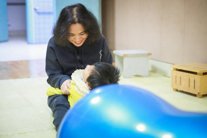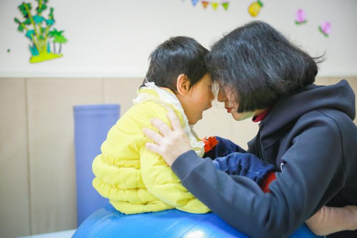 抱着脑瘫的孩子躺在垫子上,控制着小小的下半身,然后一只手给左肩一点力,再让孩子自己借力翻过去……一个翻身的动作,三岁半的萌萌需要在徐家昱的帮助下至少花上十几秒才能完成。
