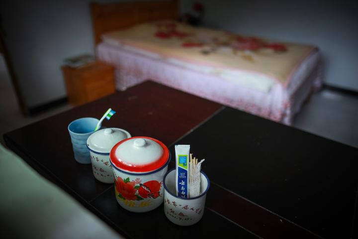 挂掉与妻子的电话,邓明斌露出了一丝不好意思的微笑。为了工作方便,他直接住在办公室隔壁的房间。一张床、一张摆放洗漱用品的木桌、一根木杆支起的衣架、两个堆满书籍的床头柜,是这个卧室的全部家当。每周有五天的时间,邓明斌都住在这里。邓明斌拿起床头柜上的白色药瓶,熟练地拧开瓶盖倒出两颗药片吞了下去,这种药他已经连续吃了2年。