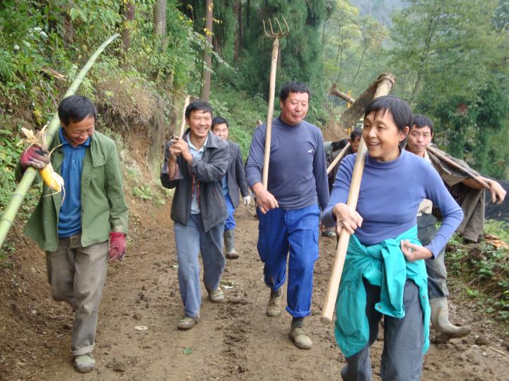 那段时间,她每天都和村民们一起,在废墟之中重建家园。一位摄影师帮廖晓义在大坪村拍摄的一组照片,成为她珍藏的宝贝。照片中的她扛着锄头,灰头土脸,绿色的衣衫系在腰间,与同样扛着锄头、一身泥土的村民说笑着行走在山间。