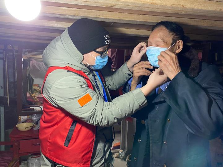张子轩为91岁的李金山戴口罩。华龙网-新重庆客户端 首席记者 佘振芳 摄