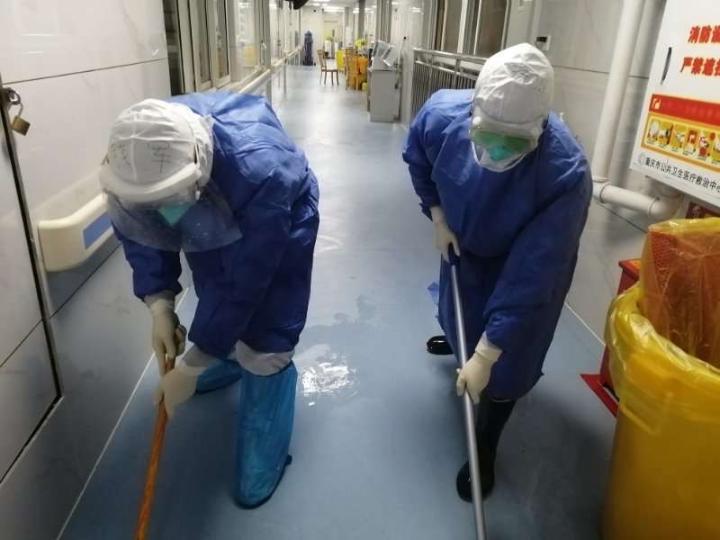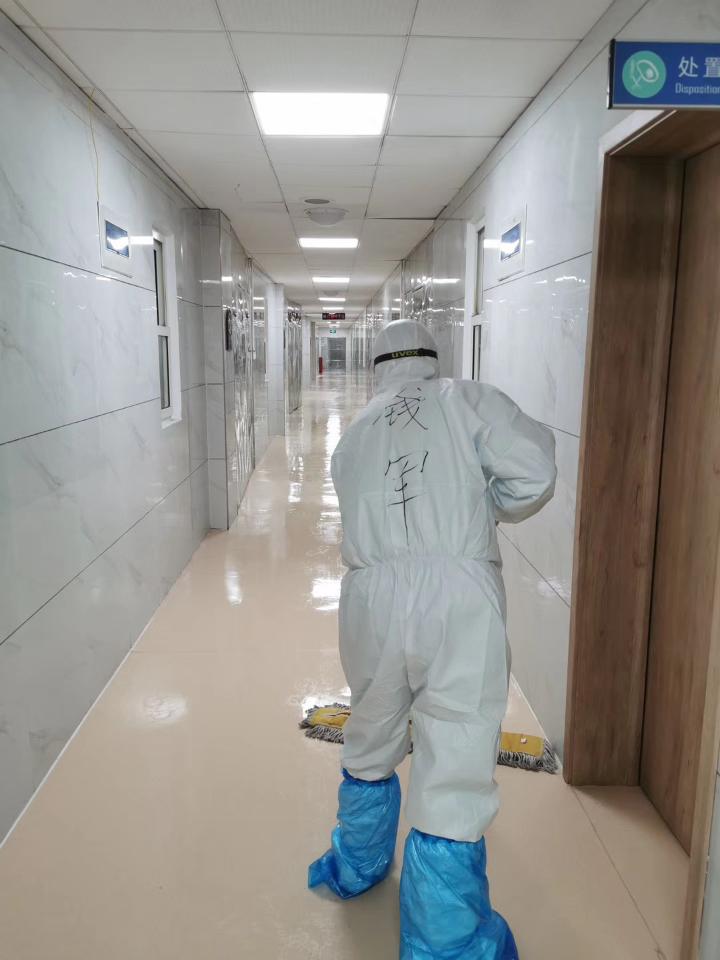 和其他战斗在隔离病房一线的同事不同,钱军做的事情看起来很琐碎,在物资最紧张时,钱军几乎在隔离病区24小时待命:处理排泄物、清扫房间、消毒、运送垃圾,还要帮助换灯泡、修门、掏卫生间等,大家戏称他是“复合型人才”。