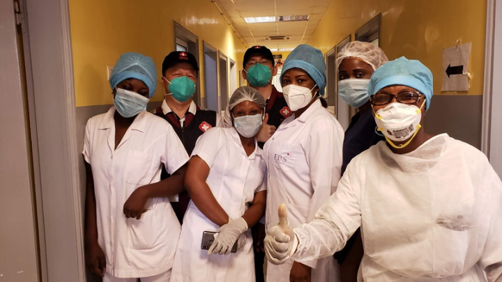 ↑ 2020年5月26日,中国抗疫医疗专家组在刚果(布)首都布拉柴维尔指导新冠肺炎病房建设时,与当地一线医务人员合影。