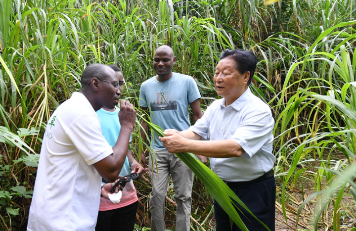 ↑ 2021年8月12日,福建农林大学国家菌草工程技术研究中心首席科学家林占熺(右一)在福建农林大学菌草园让尼日利亚留学生试尝幼嫩菌草的味道。