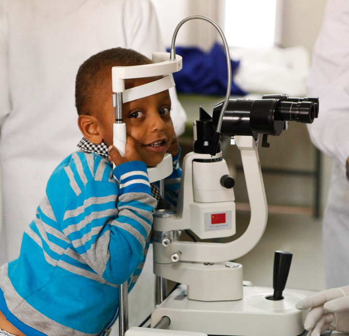 ↑ 2014年5月2日,在埃塞俄比亚首都亚的斯亚贝巴的阿勒特医院,一名小朋友等待参加“光明行”活动的中国眼科专家为他看诊。