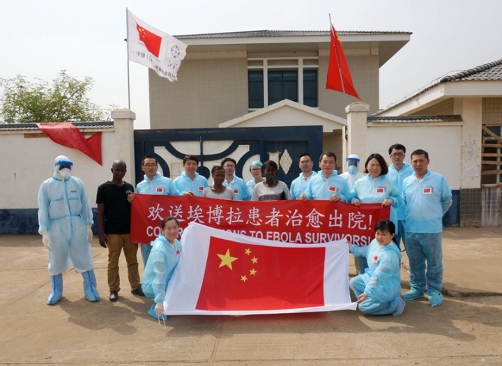 ↑ 2015年4月4日,在塞拉利昂首都弗里敦市郊的中塞友好医院埃博拉诊疗中心,中国医疗队队员与两名被治愈的埃博拉出血热患者(中)合影留念。