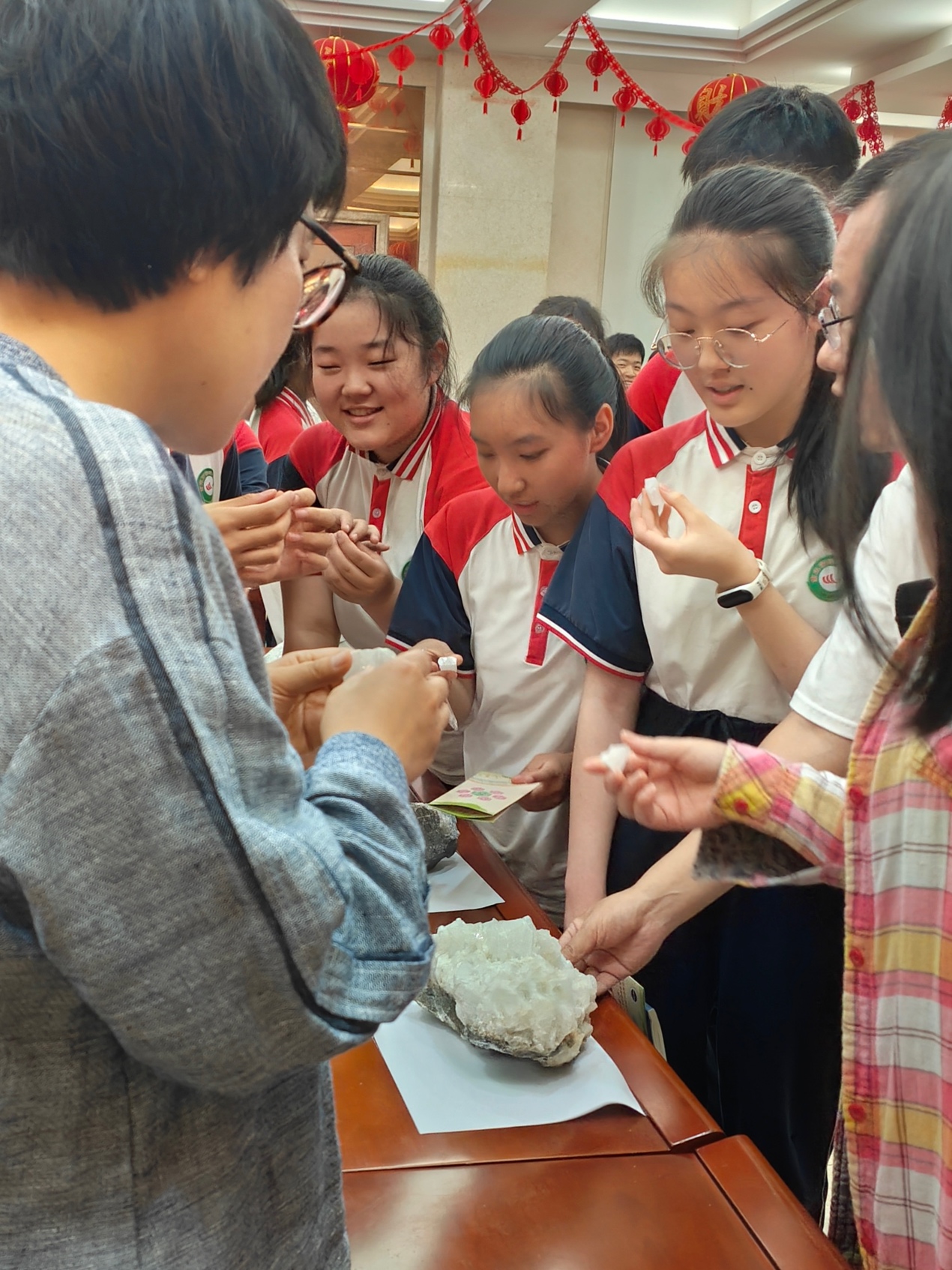 “好漂亮”“从来没见过”,同学们纷纷涌上前,满眼好奇,一边专心致志地听老师讲解,一边上前观察矿石的形态、上手触摸矿石的纹理。同学们拿着手里的矿石标本,目不转睛地盯着眼前这颗神奇的“石头”,活动现场气氛活跃、热闹非凡。