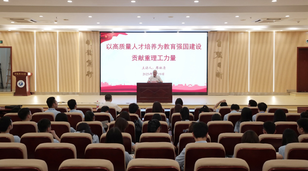 开班仪式后,廖林清为第一期“士继菁英”研究生骨干研修班学员讲授了“以高质量人才培养为教育强国建设贡献重理工力量”为题的专题党课。他围绕高等教育在建设教育强国中的作用、建设教育强国的重要任务、建设教育强国的根本抓手等三个方面,向学员们着重阐述了新时代高等教育面临的形势和新要求,用鲜活的事例、生动的语言向学员们详细介绍了学校发展历程,着重围绕党建和思想政治教育、学科对接产业、导师队伍建设、招生规模与生源质量、研究生培养能力、奖助体系功效、开放合作、人才培养质量等八个方面对学校学科建设与研究生教育发展情况进行了说明,并就“十四五”学校学科建设与研究生教育发展思路进行了重点讲解。