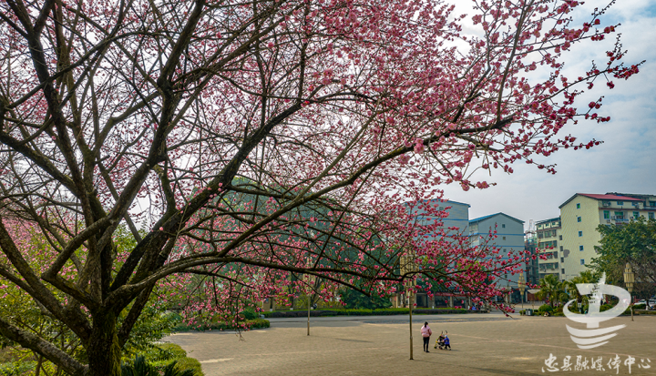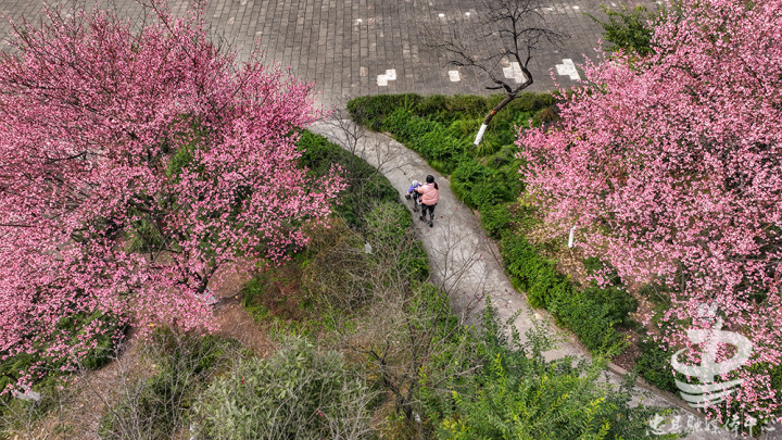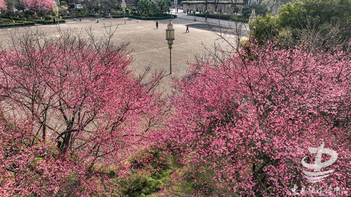 在拔山镇人民广场两侧,6棵梅花树花开正盛,远看繁花似锦、灿若云霞,近闻幽香阵阵、沁人心脾。抬头仰望,一朵朵、一簇簇梅花俏立枝头、错落有致。