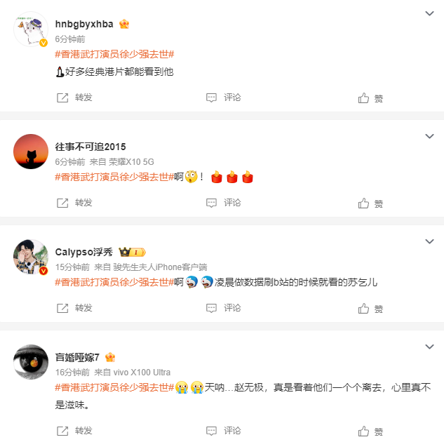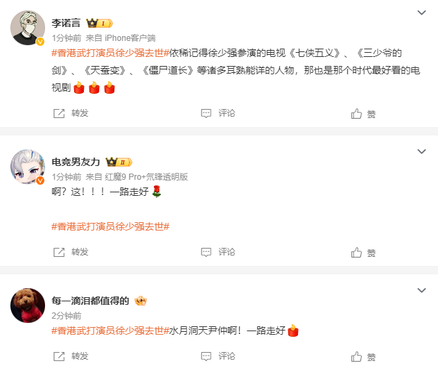 据香港媒体香港01和东网今日报道,20世纪80年代影坛的武打演员徐少强今日突然传来死讯,享年73岁。据称他于本月初在北京因食道癌离世,有媒体提问资深电影人田启文,他证实了徐少强逝世的消息。徐少强是纵横香港20世纪70、80年代影坛的武侠片巨星,早期出演过《三少爷的剑》《天蚕变》等电视剧,后来参演1992年的周星驰电影《武状元苏乞儿》,饰演大反派“赵无极”一角更令他声名大噪,近年出演《维多利亚壹号》后就开始转战拍摄网络电影。