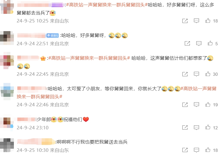 网友热评:这么多舅舅都去当兵了。这声舅舅估计他们都想家了。