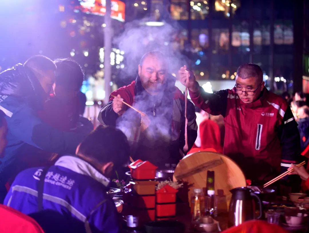 晚上7点,火锅宴席区早已弥漫着热辣的香气。主会场以城市地标“九龙门”为圆心,集合刘一手、卤校长、张崇会、喜巴蜀、渝厨、地下之城防空洞火锅、谭三娘等9个知名火锅品牌打造“九个”火锅主题店,设置打卡装置、优惠团购、核销有礼等互动模式,满足消费者多样化消费需求。麻辣鲜香的经典红汤,醇厚浓郁的牛油锅底,清新爽口的养生清汤……在这里,你都能找到满足自己味蕾的那一口美味。“我通过九龙坡的官方新闻号了解到本次火锅欢乐节的消息,于是就带着家人朋友一起来吃火锅、凑热闹。”市民鑫鑫告诉记者,作为重庆人,火锅一直是她的最爱,“这次在九龙门下吃火锅,感觉特别不一样。一边看轨道列车驶过,一边欣赏精彩的表演,嘴里还品尝着美味的火锅,这样的经历太难忘了,确实欢乐很多!”