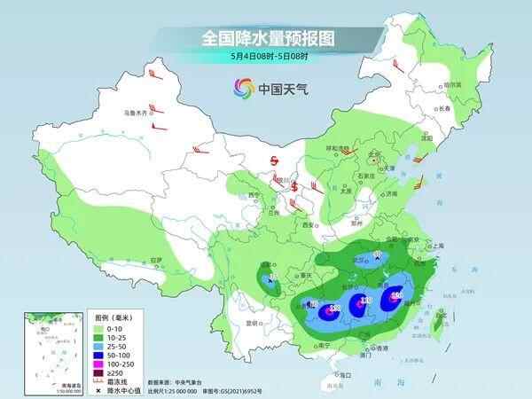 后天,四川盆地东南部、贵州西北部、江南中南部、华南中北部和南部等地部分地区有中到大雨,其中,广西东部、广东西北部等地部分地区有暴雨。
