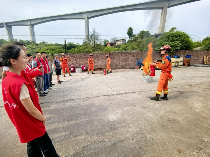 理论授课后,消防员进行了规范灭火演示:快速提起灭火器、拔除保险销、瞄准火源根部喷射,白色干粉瞬间覆盖燃烧区域。参训人员认真观摩动作细节,并在分组实操中轮换体验。