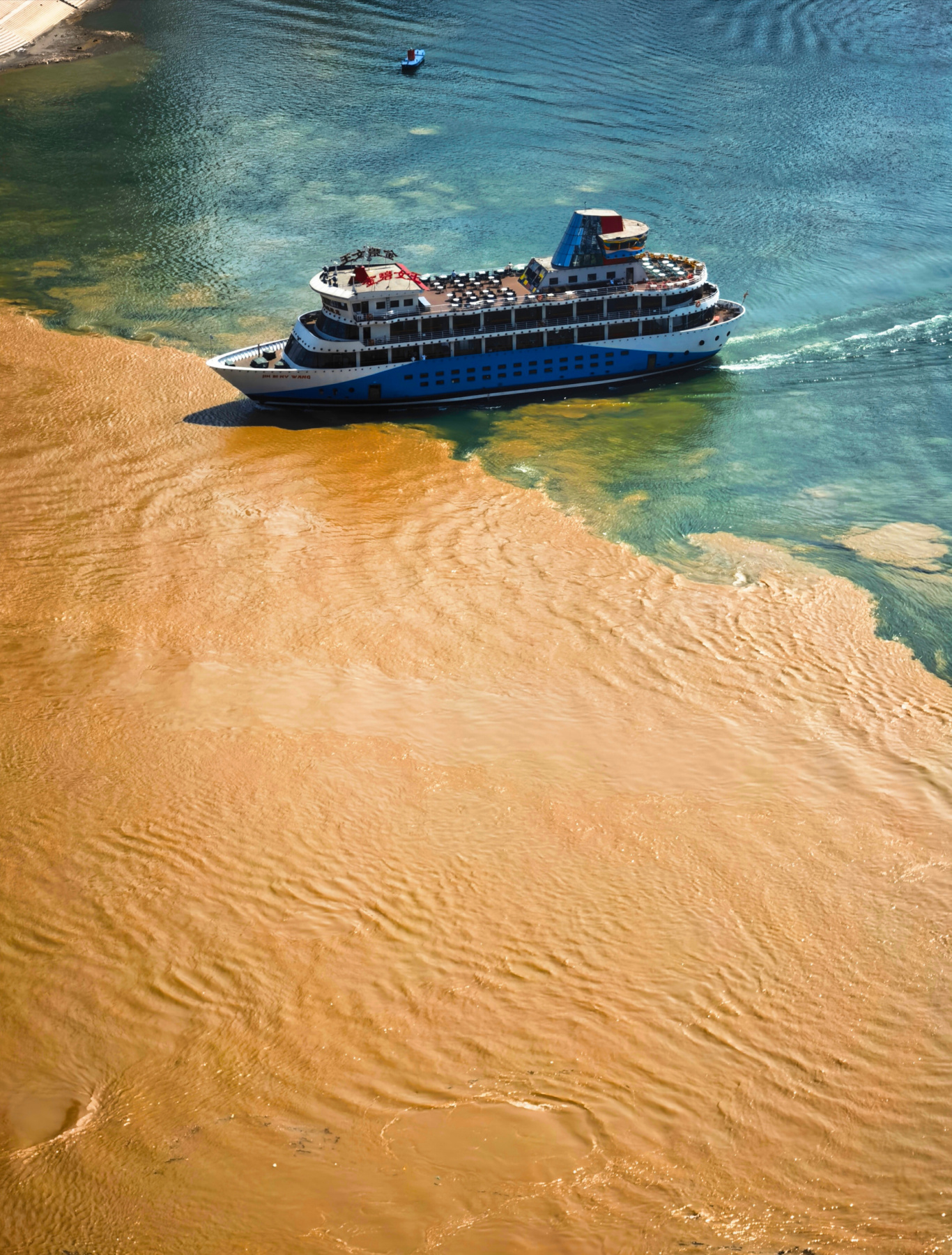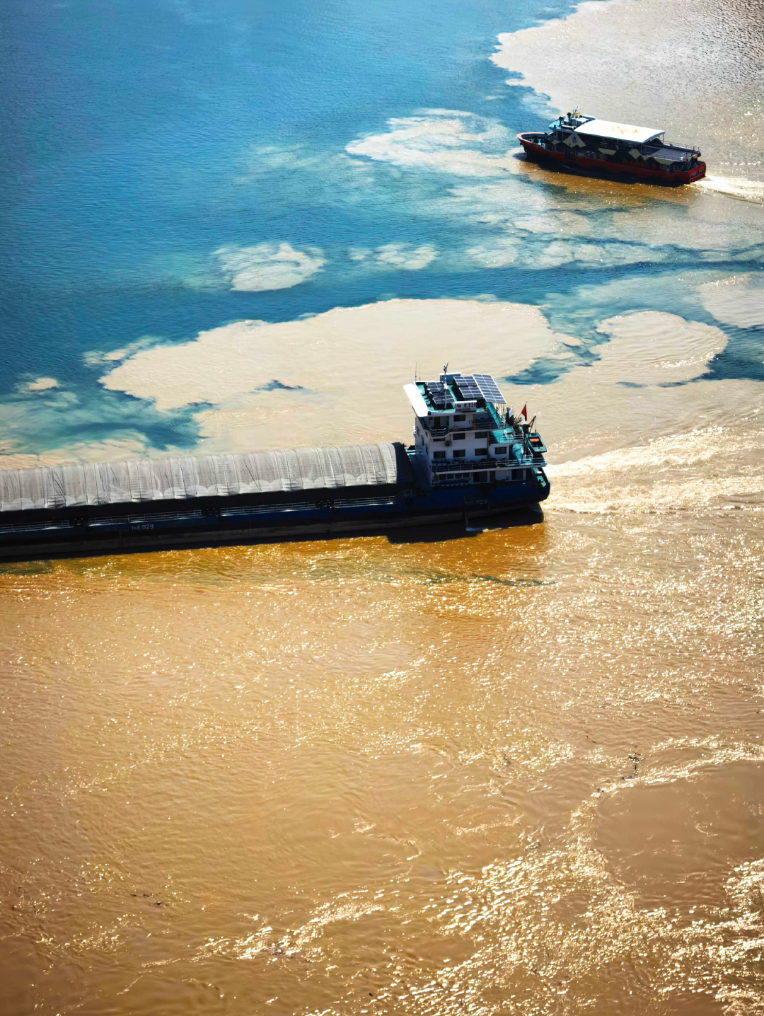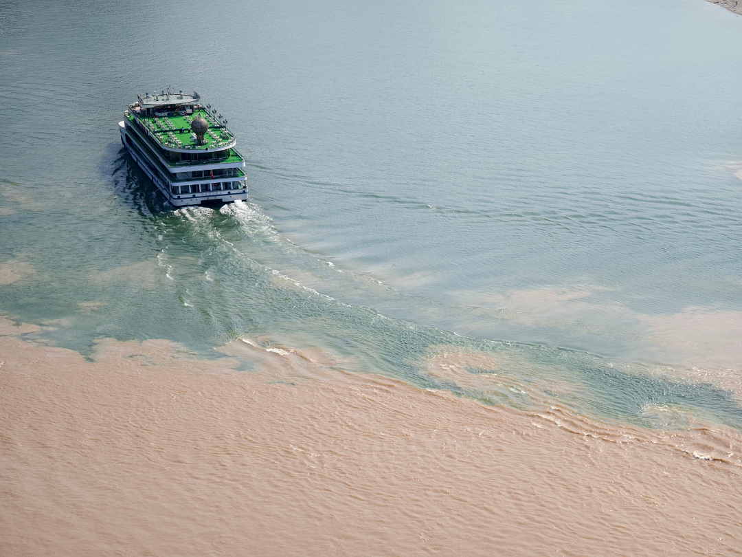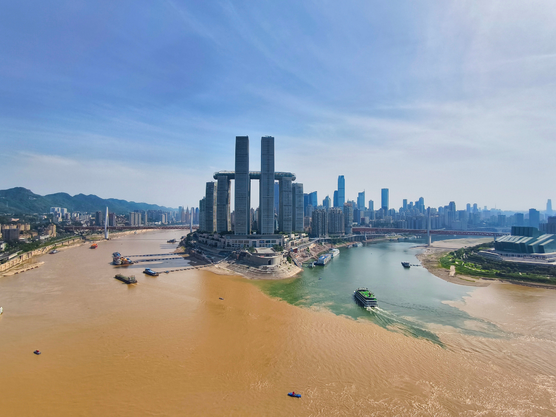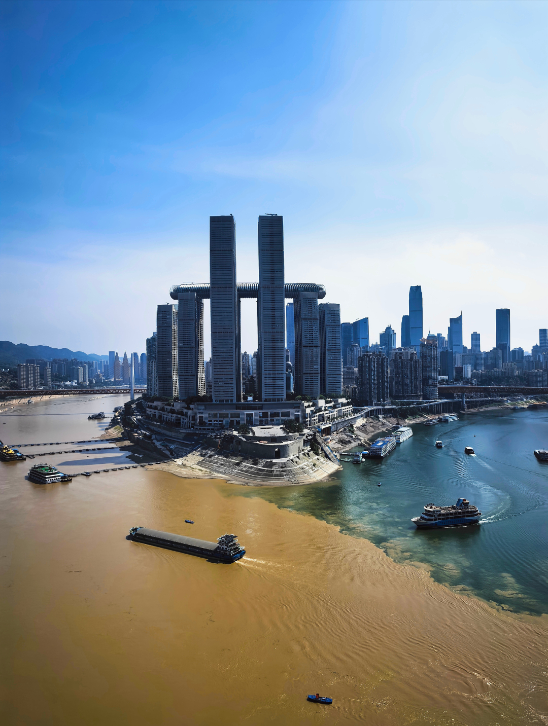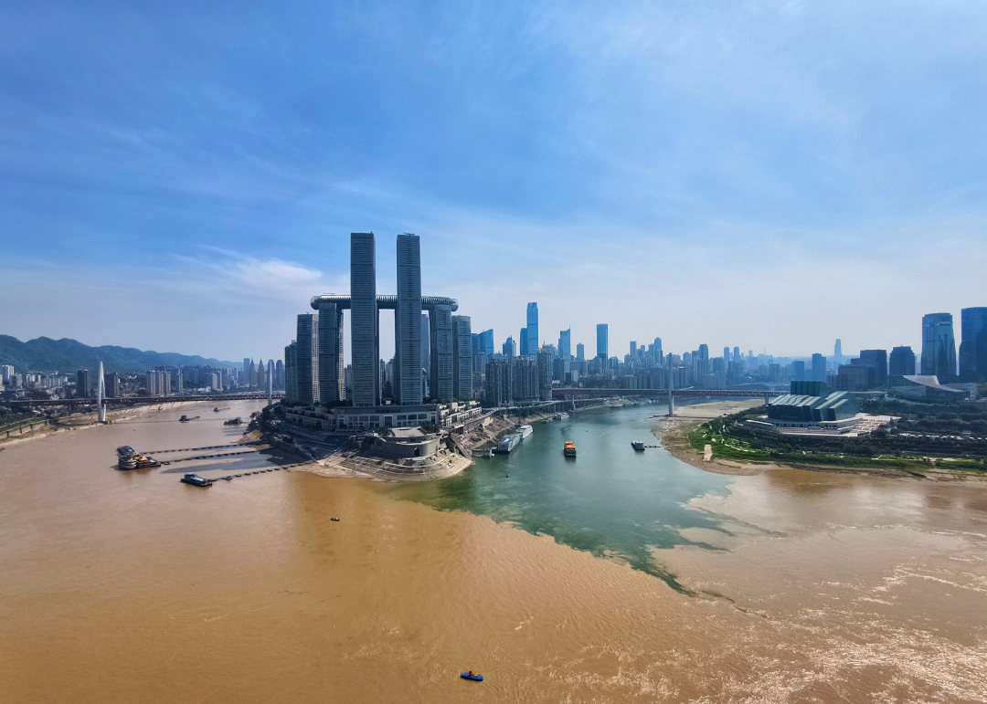 2025年5月26日,在重庆南滨路,受上游水系短时强降雨影响,重庆朝天门码头,两江交汇处再现长江和嘉陵江“相汇”的自然奇观,酷似超大“鸳鸯锅”。
