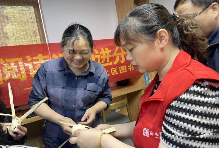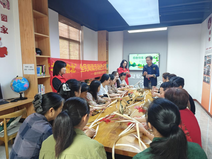 渝北区图书馆至玉峰山镇石坪社区开展“粽香传情,非遗传承”主题活动,邀请了重庆市非物质文化遗产棕编技艺代表性传承人进行现场指导。活动伊始,非遗传承人首先为居民们详细介绍了棕编的历史渊源与技艺特点。从古代劳动人民的智慧结晶到如今的国家级非遗项目,棕编所蕴含的自然环保理念与精巧工艺让在场居民连连称叹。进入动手实践阶段,30余名居民在传承人的一对一指导下正式 “上手”。尽管初始时手法略显生疏,但在反复尝试与调整中,一个个形态各异的粽子棕编作品逐渐成型。现场气氛热烈,居民们不时互相交流心得,笑声与讨论声此起彼伏,充分展现了对非遗技艺的浓厚兴趣。