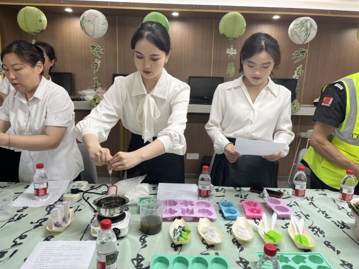 桐桷村邀请辖区企业员工到村委会开展了“粽夏欢聚 悦享端午” 端午节活动,制作前,老师向群众们讲授艾叶手工皂的历史由来和功效,介绍制作香皂所需的材料,包括艾叶汁、皂基、精油、除泡剂、烧杯、加温器等。大家根据不同爱好、需求制作出不同颜色、形态各异的香皂,色彩丰富,造型新颖,尽情感受节日的快乐!