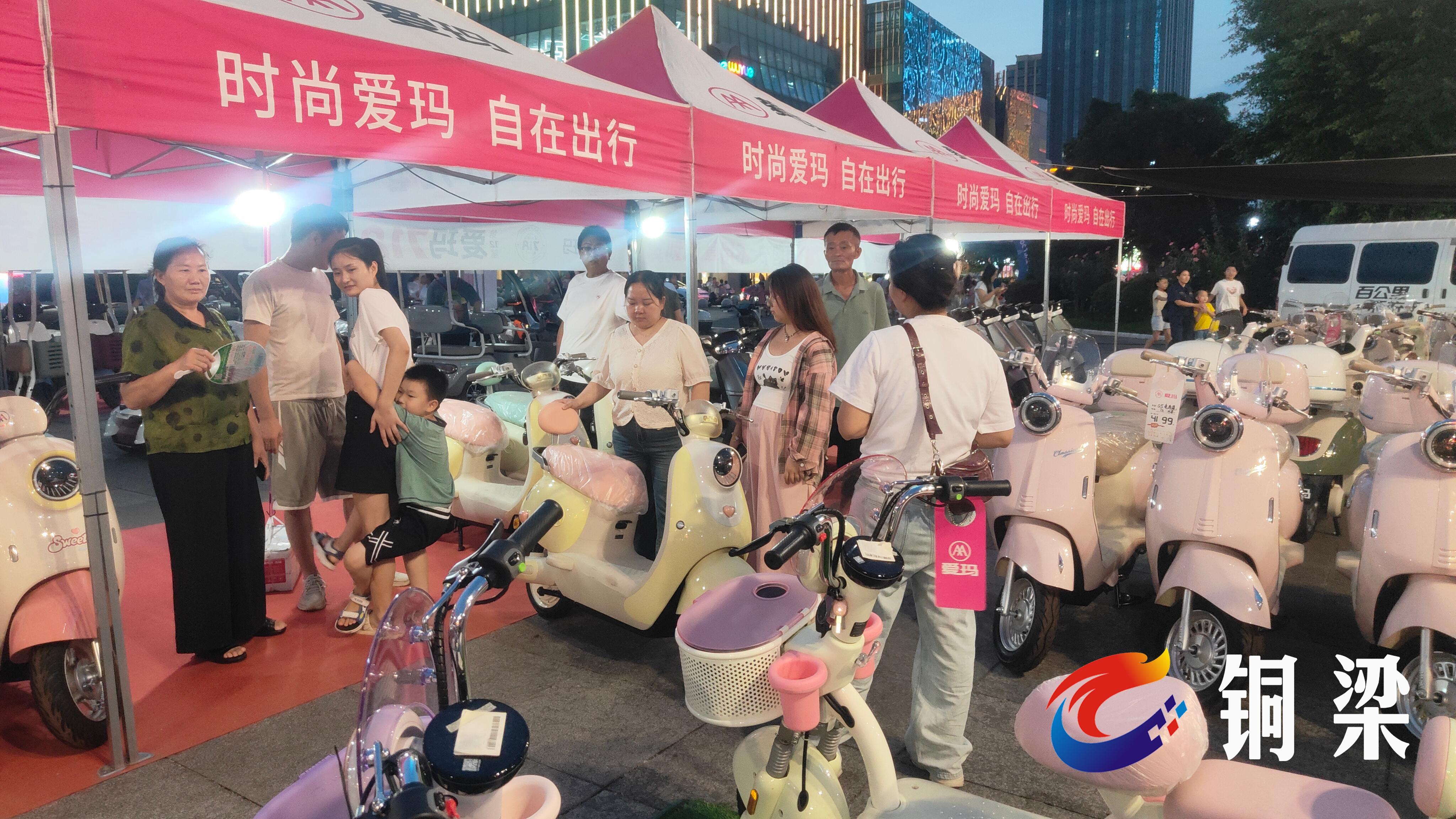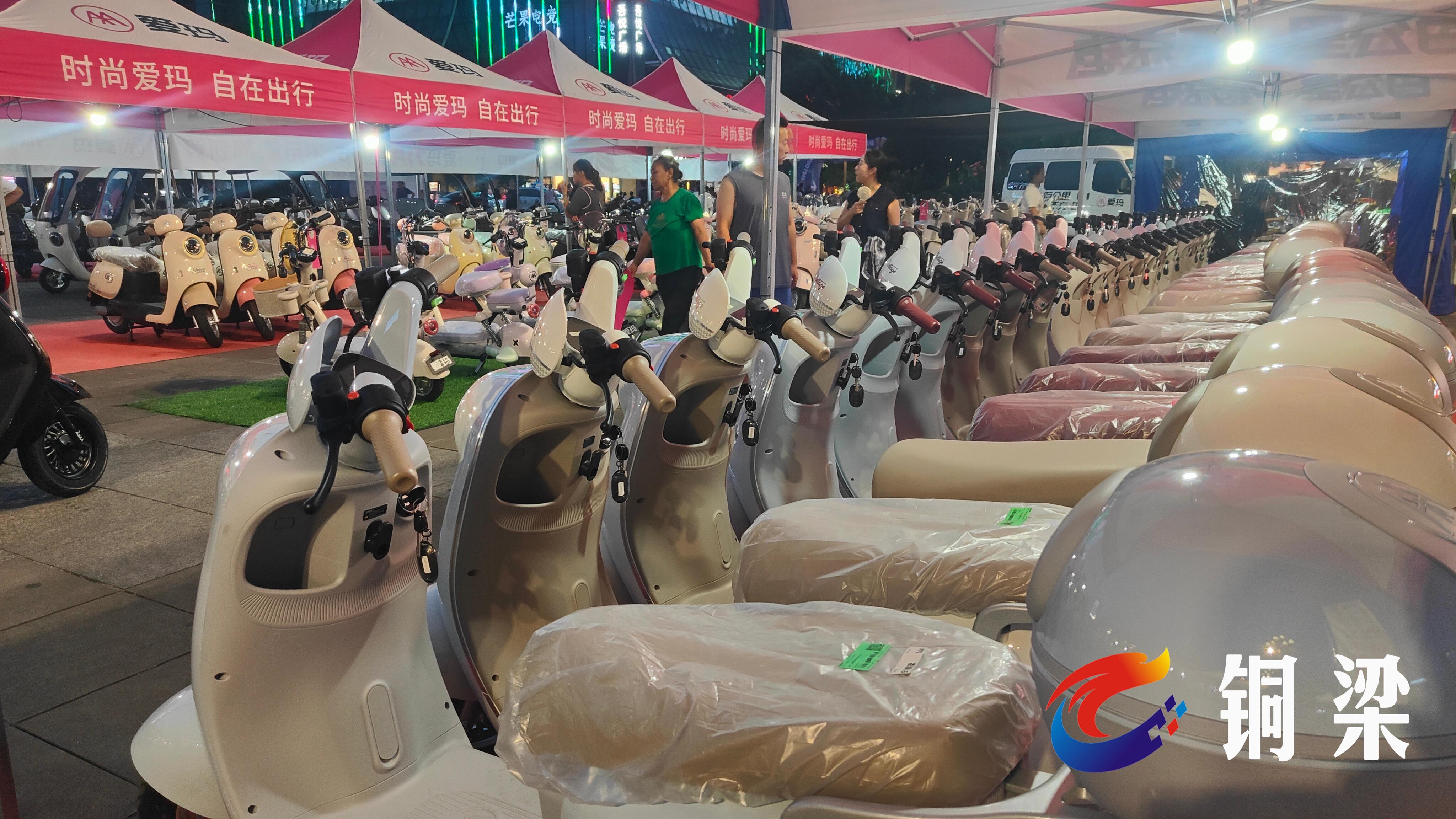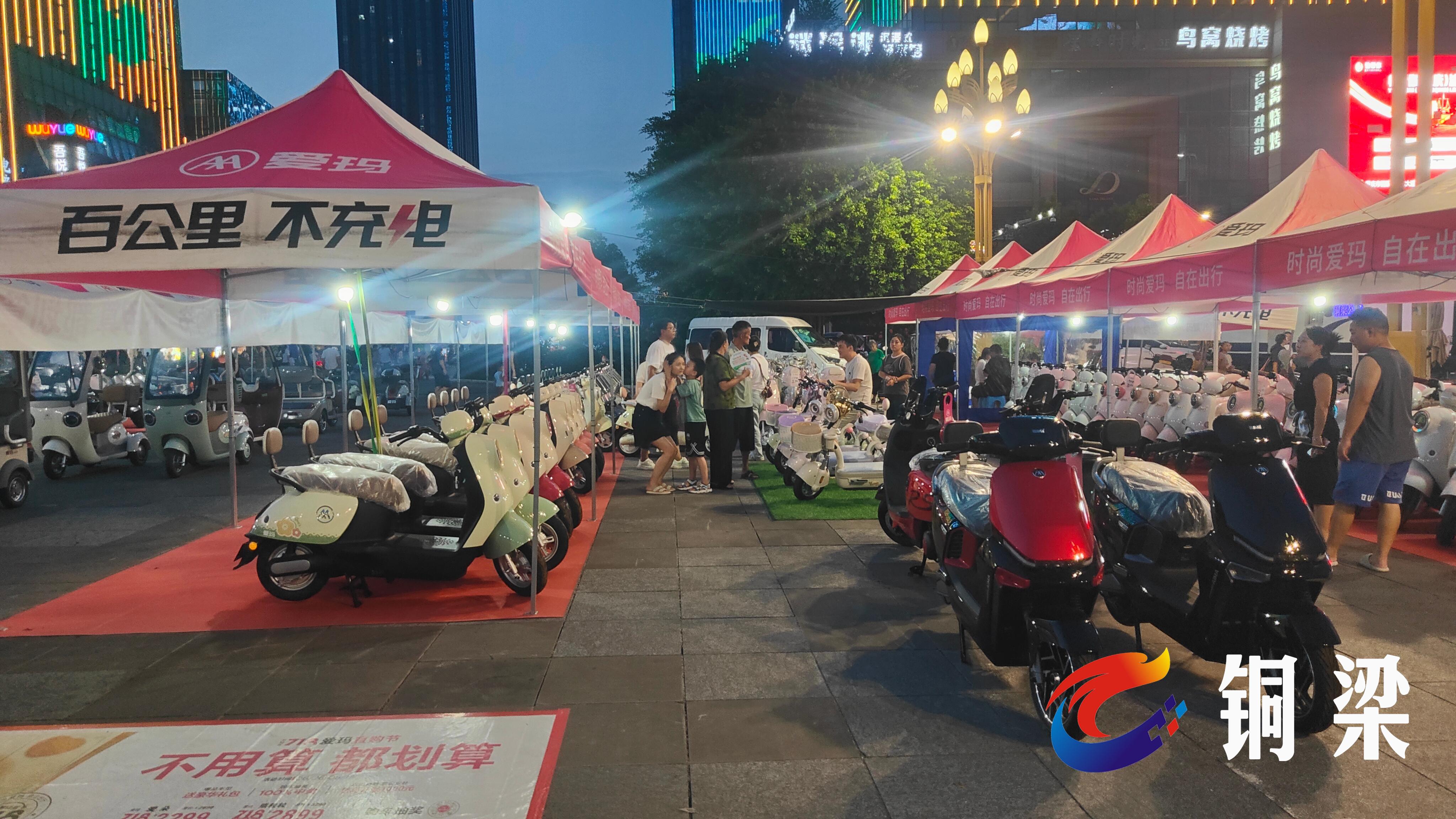 7月19日晚,铜梁龙城天街热闹非凡,不少市民朋友在这里休闲购物。在多家电动摩托车销售摊位前,销售人员热情介绍车辆性能、价格优惠、以旧换新等信息,进一步激发了消费者的购买热情。