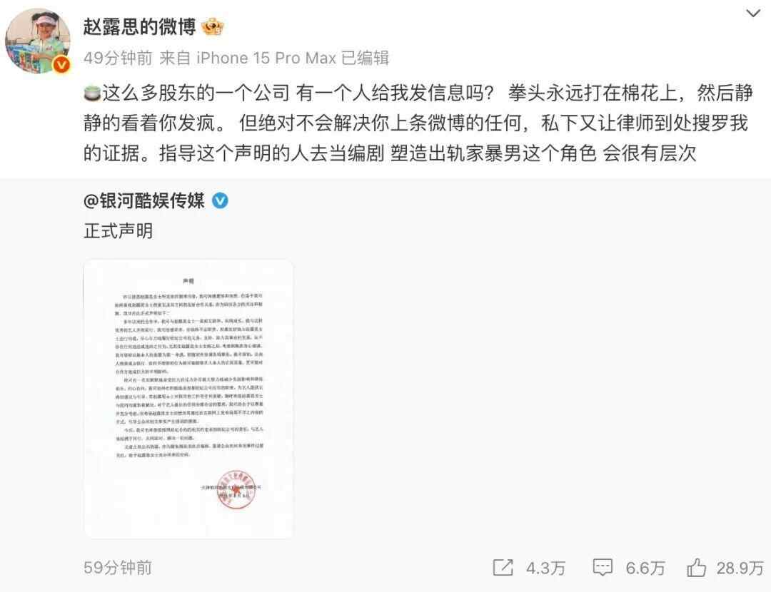 8月3日,赵露思经纪公司@银河酷娱传媒 发布正式声明,回应赵露思8月2日的长文控诉,称深感震惊和突然,从不存在任何违法或违约行为,望赵露思女士后续勿再发布语焉不详内容,引导公众产生错误猜测。