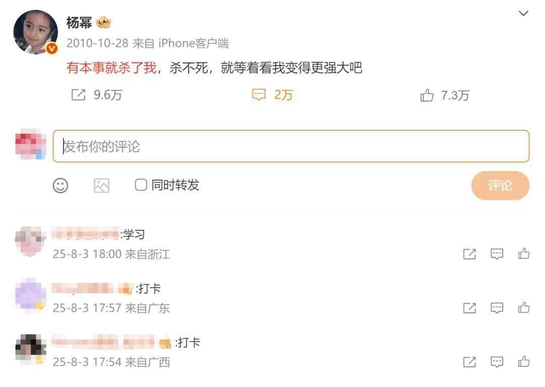 记者注意到,此事发生后,多位网友到杨幂10年前博文留言打卡,杨幂疑因公司原因曾提到:有本事就杀了我,杀不死,就等着看我变得更强大吧。