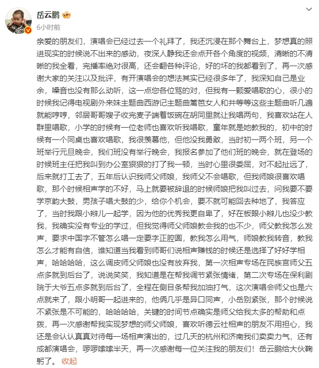 岳云鹏发长文回应办演唱会:我是业余但有颗爱唱歌的心;此前其演唱会被质疑“没歌唱、票价贵”