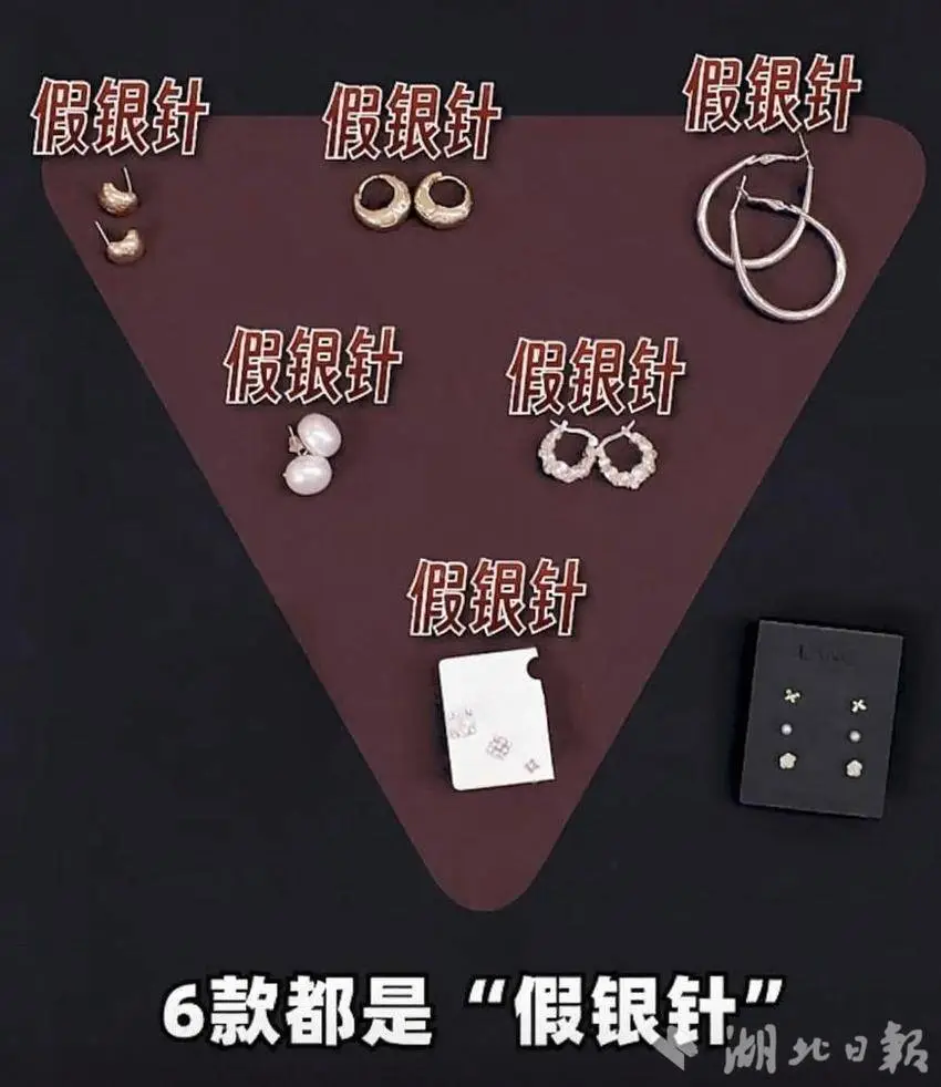 6月19日,该博主在公证人员监督下,对线上线下8款带有925钢印的银耳饰进行检测,样品分别来自批发市场、网店和商场。结果显示,8款耳饰中有6款为假银针,材质实为铜合金。其中3款镍释放超标,最高的超标61倍。还有一款带钻耳饰镉超标1179倍。镉是世界公认的高毒性重金属,被国际癌症研究机构列为一类致癌物,在人体内几乎不代谢。