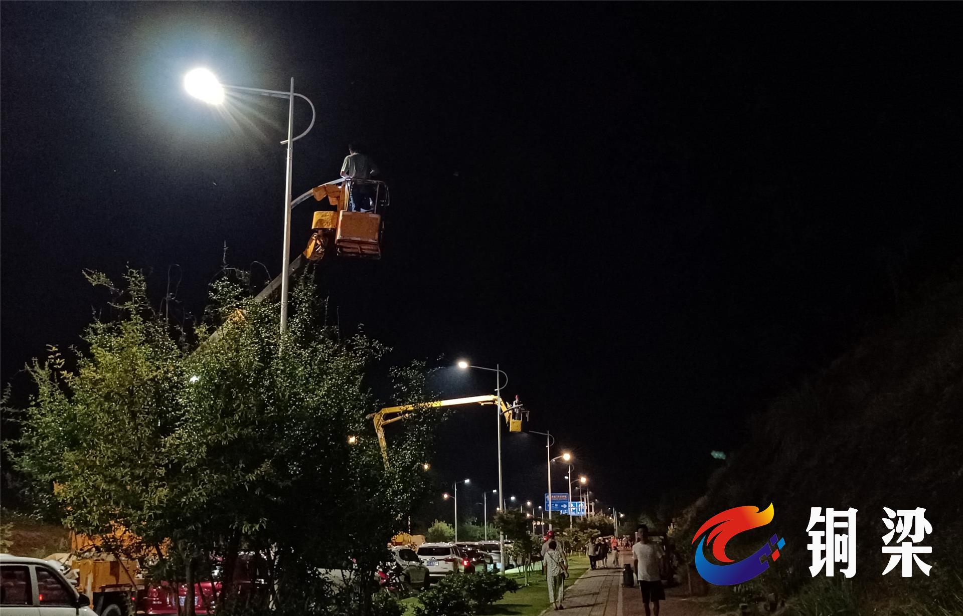 8月7日晚,铜梁城区龙腾大道西段的一侧路灯不断闪烁着,市政工人正借助高空作业车更换老旧路灯。随着一盏盏崭新的灯具安装到位,电路调试完毕,已更换新路灯的街道被照射得更加明亮。