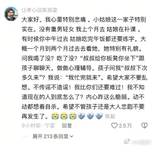 胡雷否认去世女孩遭虐待、家里重男轻女,称女孩成绩好,只是一时想不开,女孩家人:家里爷爷奶奶不需要捐助