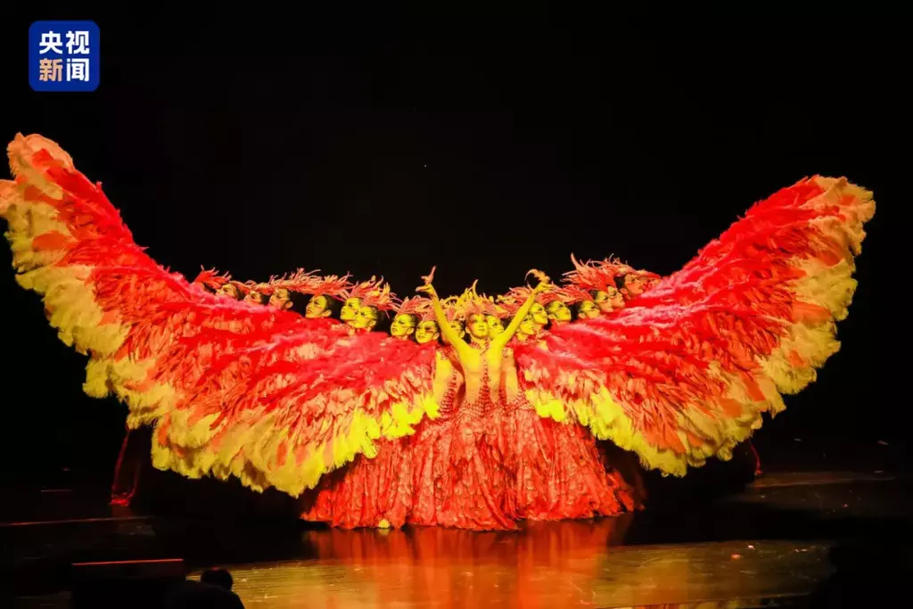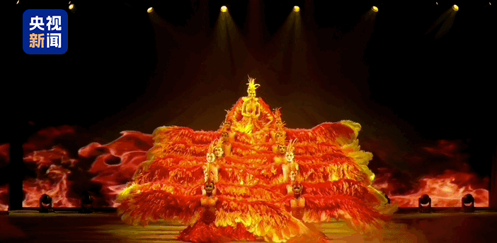 近日,在汇演现场,21名舞者共同构成翱翔的金色凤凰,左右各十人如巨大双翼整齐舞动,昂扬向上,凤凰的浪漫神秘和向阳而生的精神,在此刻绽放。