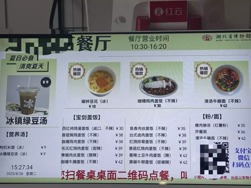 8月26日,九派新闻记者前往湖北省博物馆,在四楼的一家餐厅内发现,这里确实有多款“宝剑盖饭”在售,价格从30元到42元不等,包括鱼香肉丝、台式卤肉、红烧排骨等多种口味选择。