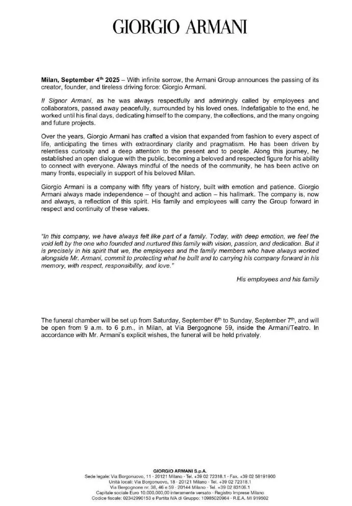 告别仪式将于9月6日(周六)至9月7日(周日)在米兰Bergognone大街59号Armani/Teatro举行,每日上午9点至下午6点对外开放。遵照Armani先生的意愿,葬礼将以私人形式举行。