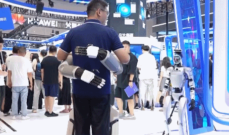 展会中有一个叫“小五”的机器人。听从指令后,“小五”的双臂会轻缓抱住工作人员,它的大脑能通过压力传感器精准控制力度,既保证拥抱的稳定性,又避免过度用力。