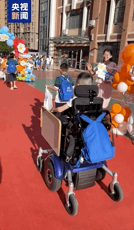 9月1日开学第一天,小石头坐在轮椅上,和其他同学一起在操场上完整观看了开学典礼。小石头的爸爸曾一度担心他支撑不下来,“我一开始觉得时间挺长,他可能坐不住,但他非常愿意参加集体活动,一直坚持到最后。”