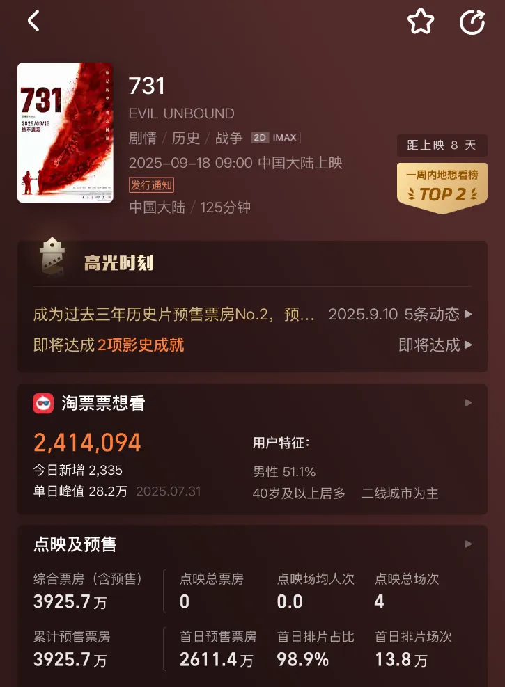 据灯塔专业版显示,截至9月10日,电影《731》预售票房已超4000万元,首日排片占比超98.9%。