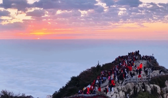 泰山是世界文化与自然双遗产,秋日里层林尽染。破晓前,天际由黛青渐转橘红,顷刻,红日跃出、赤轮如锻、金光洒落,云海同步沸腾,浪头托举群峰。随着太阳升高,光明和温暖再次覆盖了大地。