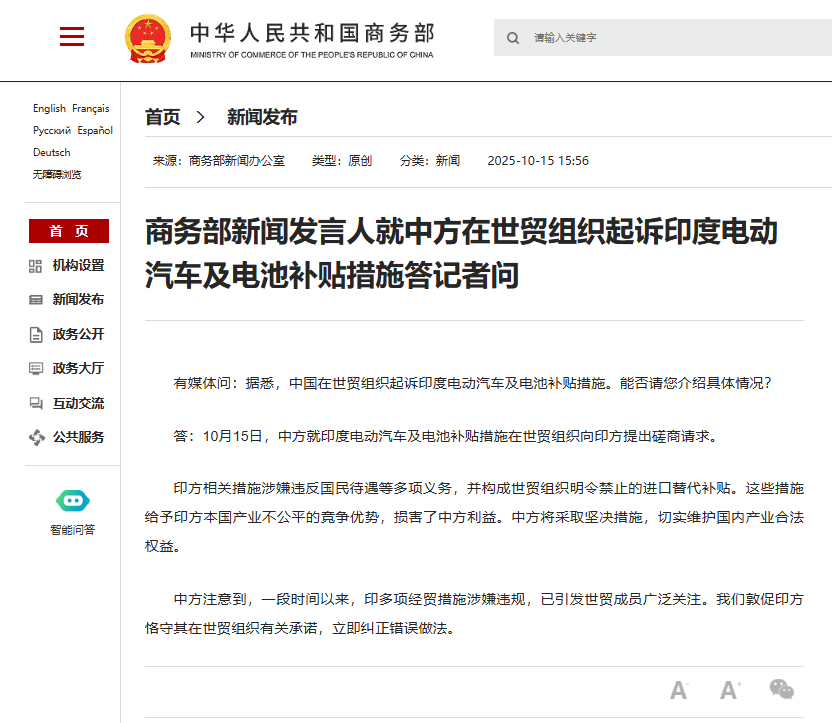 答:10月15日,中方就印度电动汽车及电池补贴措施在世贸组织向印方提出磋商请求。