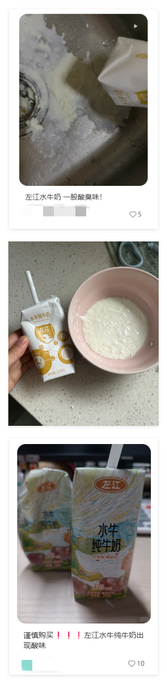 长江云新闻记者进一步检索多个社交平台发现,近两个月内,已有多地网友反映“左江水牛纯牛奶”品类存在类似质量问题,且生产日期多为近期,并非久置产品。值得注意的是,有消费者投诉称,即便经过客服协调换货,收到的产品仍出现发酸、结块等变质现象。