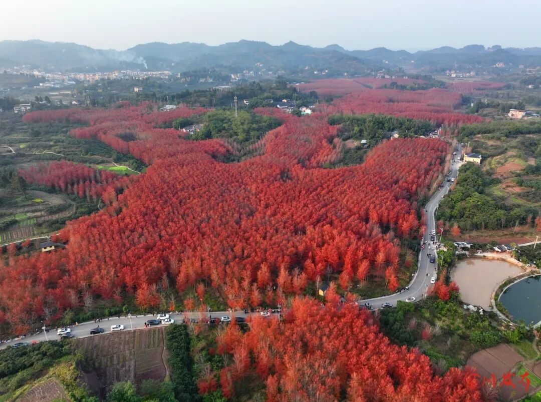 据了解,合川区古楼镇红枫林基地面积约1200亩,栽种有近6万棵红枫。最近一段时间平均每天有近万名游客前来游玩,观赏期还将持续半个月左右。这个藏在乡间的自然美景,不仅为游客提供了就近休闲赏景的好去处,也为乡村振兴注入了文旅活力。