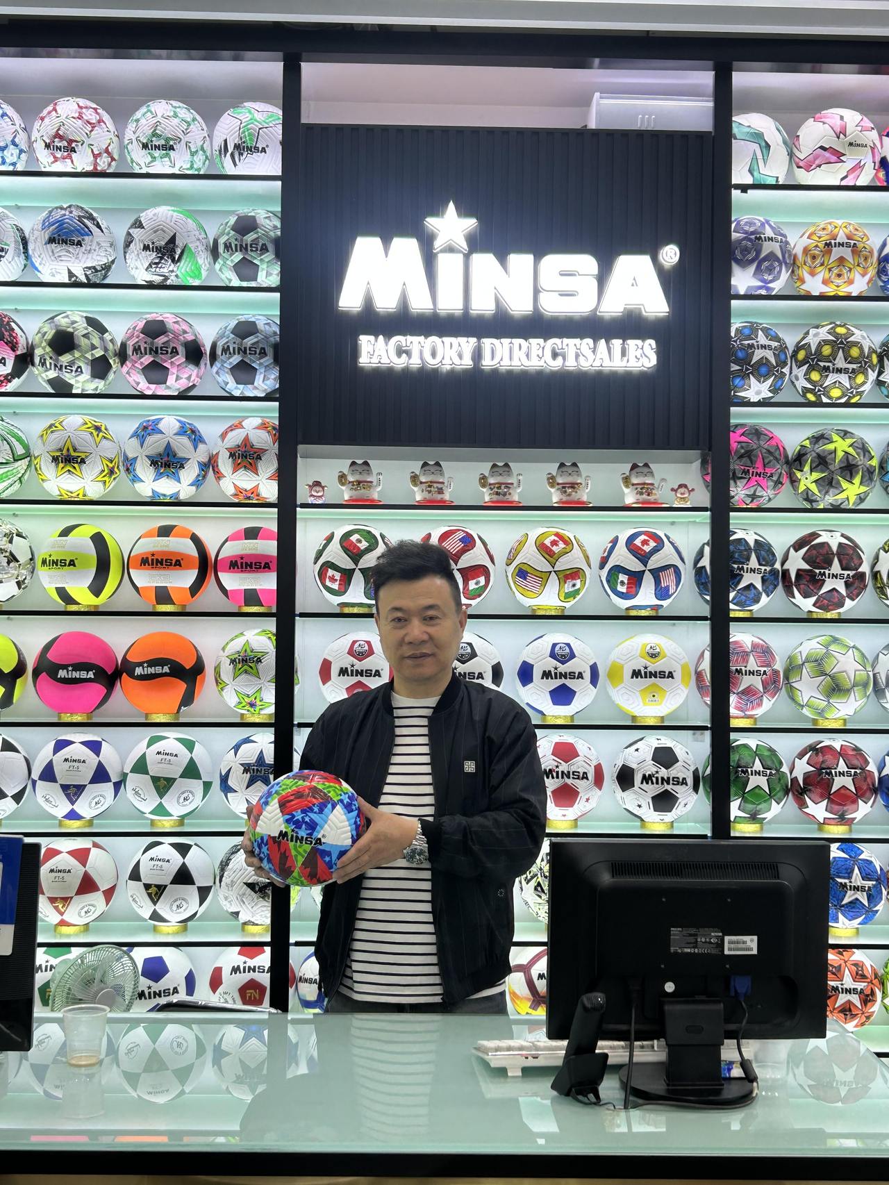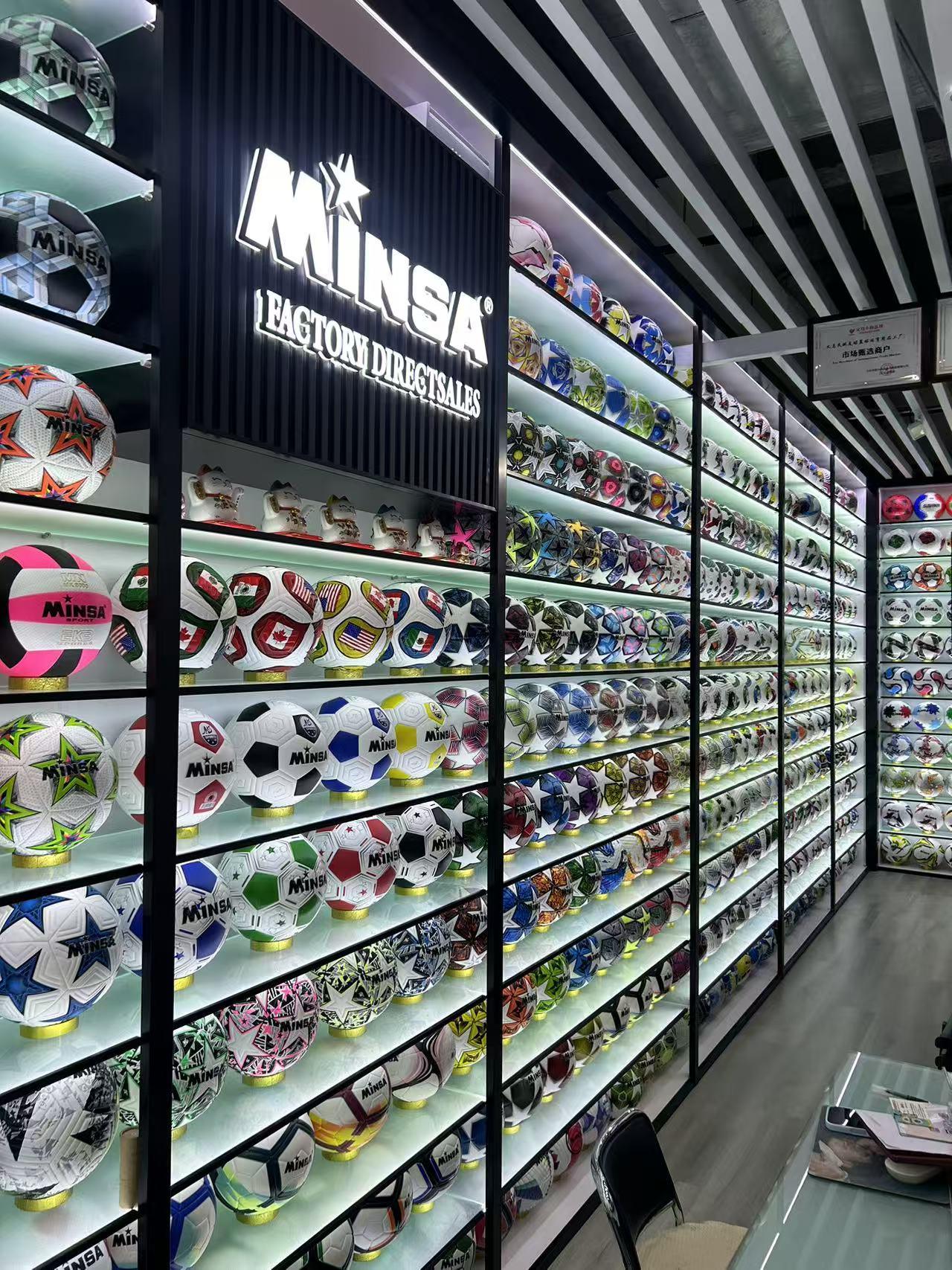 他的货架上,摆放着五颜六色的足球,他亲自设计的美加墨世界杯纪念球,是卖得最好的大热款。从选图案、颜色,到接缝缝合,每一道工序都精心制作。