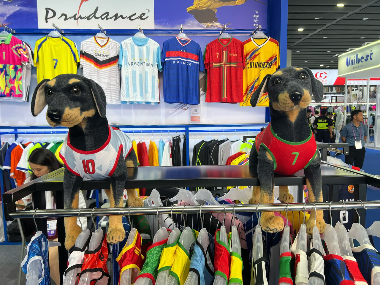 货架上,两只仿真小狗玩偶,穿着宠物款球服,灵动可爱,吸引了往来客商的目光。