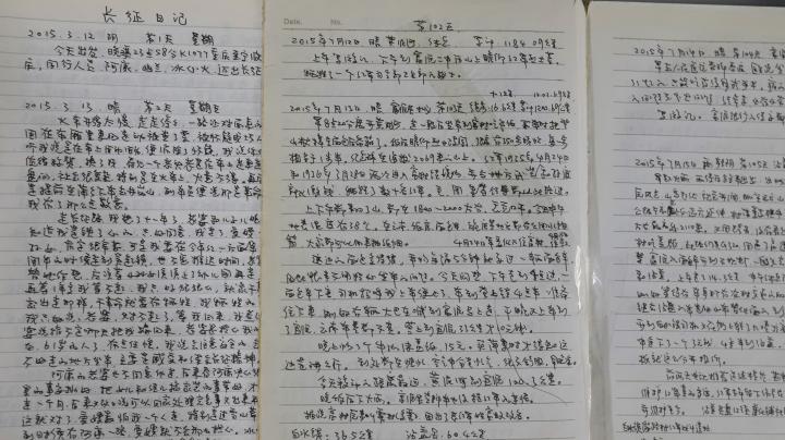 “三长”之行累计创作行走日记80万字。厚厚的日记本已泛黄,手机备忘录里存储的电子日记,几十屏刷不到头。长征、长城之行的文字已经集结两本书,长江之行的书册正在筹备。