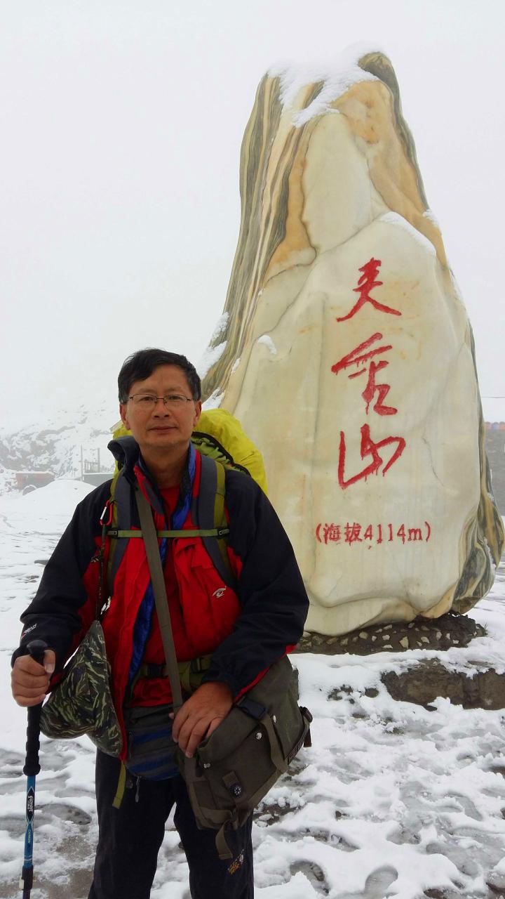一身户外运动装备,精神抖擞,肩上20多公斤的行囊,压得身体略为前倾。背着干粮和水爬雪山、过草地时,谁能想到他是个退休老头。