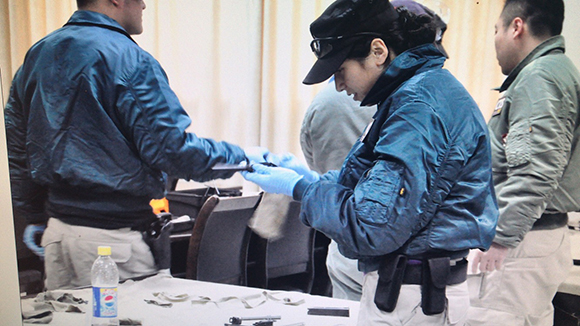 行动开始,持盾牌战友一脚踹开房门时,“嗖”,一个酒瓶飞过来。队友立即举盾牌抵挡,“砰”的一声,酒瓶碎了一地。